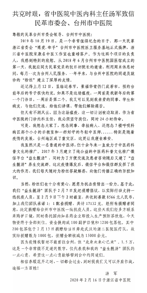 去年,民革浙江省委會“博愛.牽手”臺州市中醫(yī)院醫(yī)衛(wèi)服務基地正式揭牌落戶。作為項目的負責人,湯軍主任雖然堅守在省中醫(yī)院的門診內(nèi)科,但依然心系我院。在得知我院物資緊缺后,湯軍主任的“益生靚湯”團隊即刻發(fā)起捐贈倡議,以實際行動支持一線抗疫人員,并經(jīng)所有捐贈者同意后,將團隊1:1配套捐款換購成100副護目鏡和1000包茶包捐贈我院。