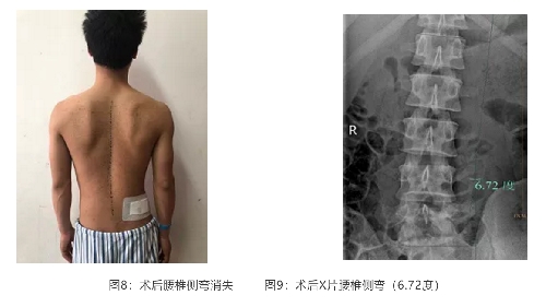 患者術(shù)后腰腿痛完全消失,腰椎側(cè)彎也明顯改善(圖8、9),且術(shù)后無需完全臥床,完全可以生活自理。
